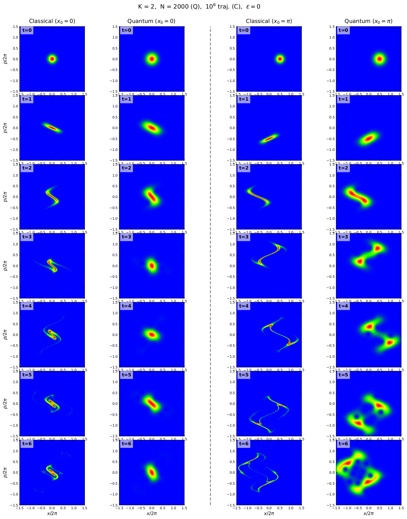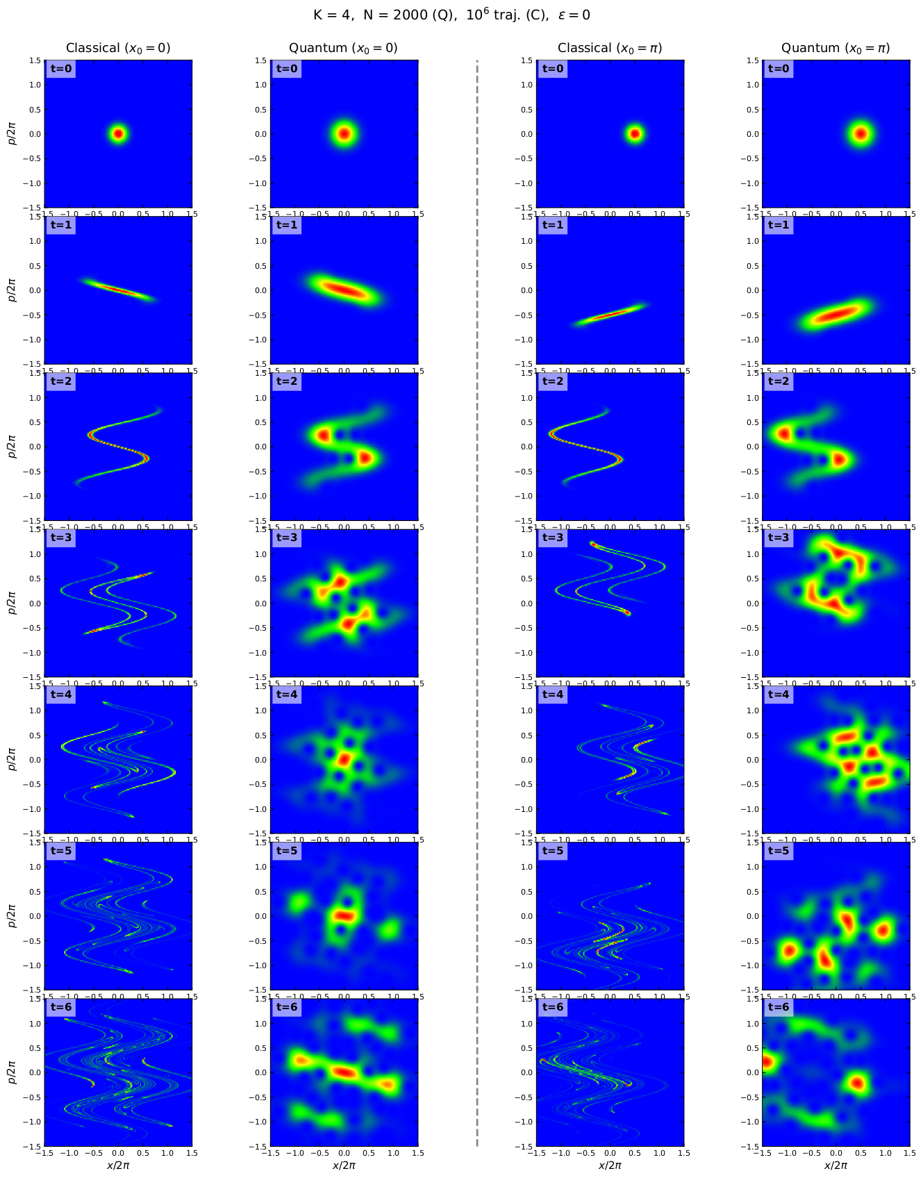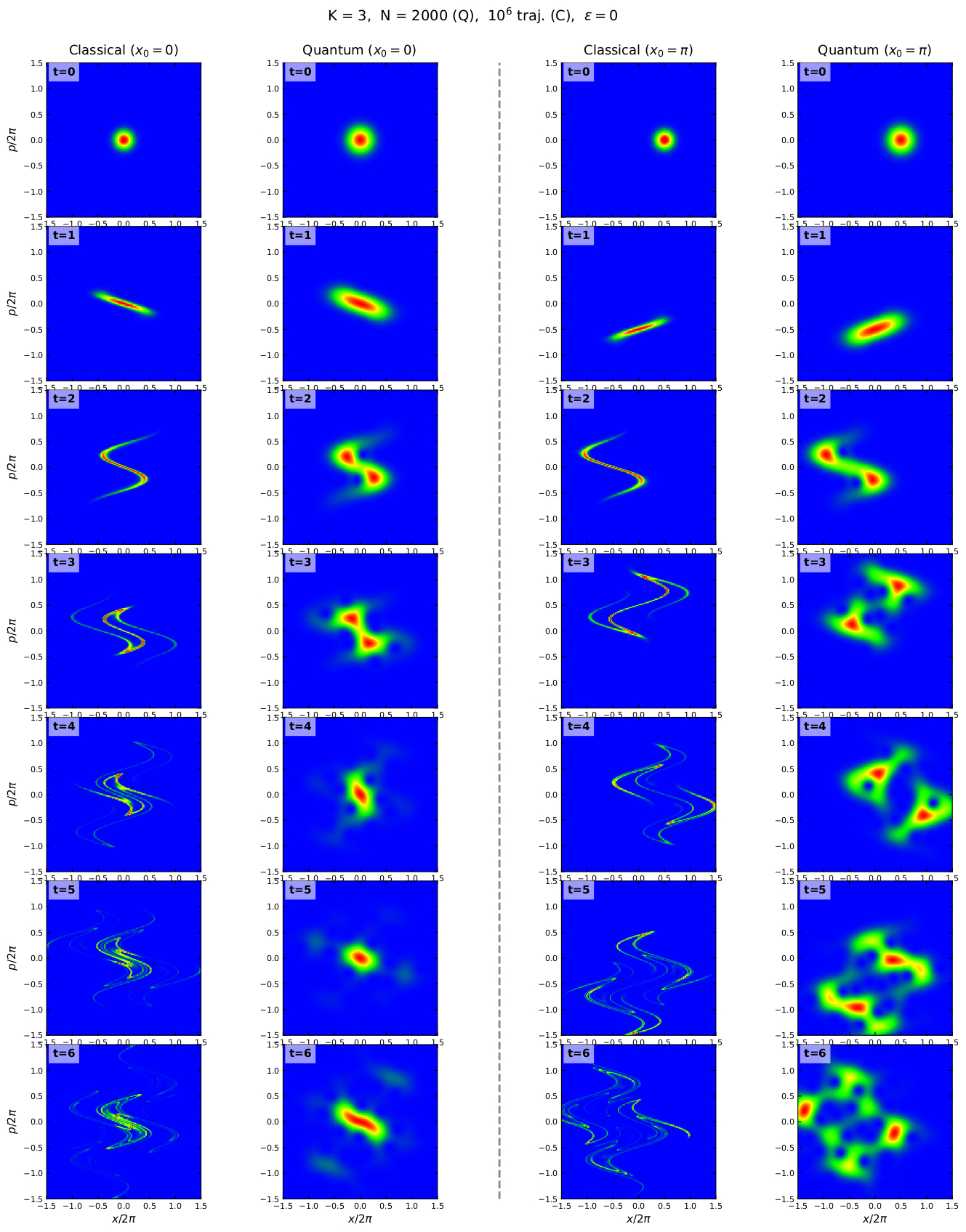 at tr=30, here K=8, hbar=1, eps_q=0.1, 1 noise realisation (here) Classical and quantum time evolution on first 6 iterations (kicks)
