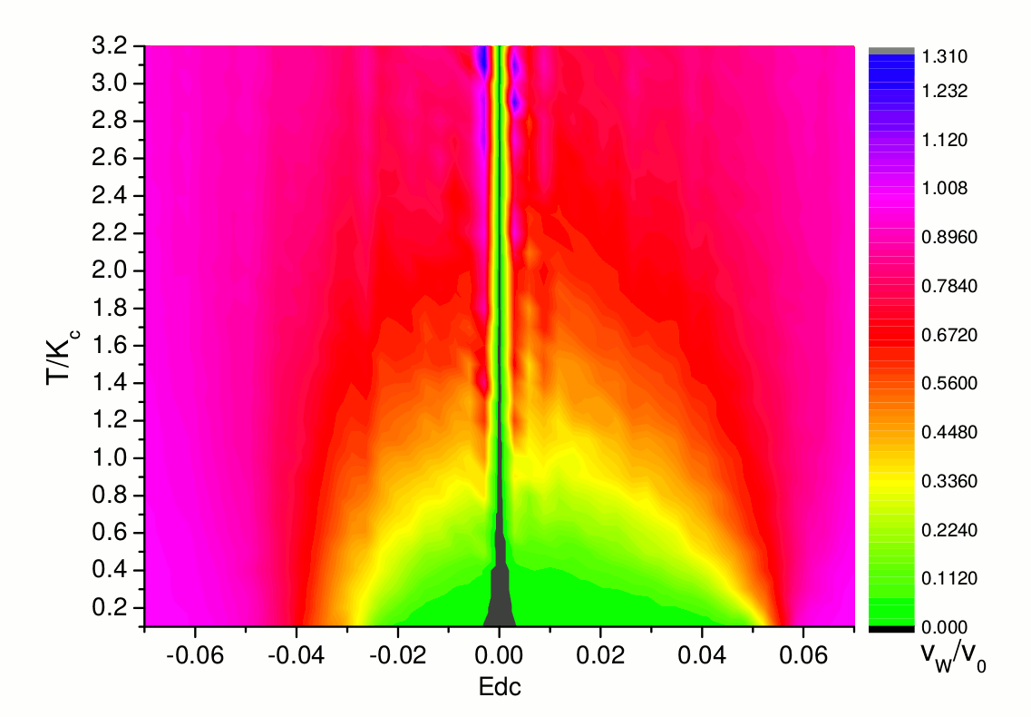 Dependece of rescaled Wigner crystal velocity v_W in an asymmetric 2D potential (shown by color) as a function of aplied static field Edc and temperature T divided by potential amplitude (v_0 is velocity of free charge)