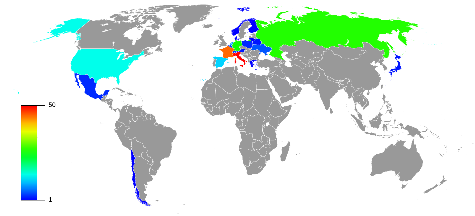 World map of countries of birth of 223 painters from top 100 PageRank painters from each of 7 Wikipedia editions of 2013